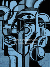 The artwork captures the essence of memory through fragmented, angular shapes, where the blue symbolizes recollections. Cubist forms overlap and distort, creating a sense of disjointed yet cohesive recollection, where the passage of time is felt in the sharp, intersecting planes. The bold use of blacks evokes both calmness and melancholy, serving as a visual metaphor for the emotional weight carried by memory, reshaped and reimagined.
