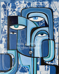Modernes kubistisch-expressionistisches Gemälde mit ineinander verschlungenen Gesichtern von Ishita Banerjee, wiedergegeben in stimmungsvollem Mineralblau. Blues ist eine Darstellung der gegenseitigen Abhängigkeit zwischen Menschen und ihren Geschichten, die ineinander übergehen.