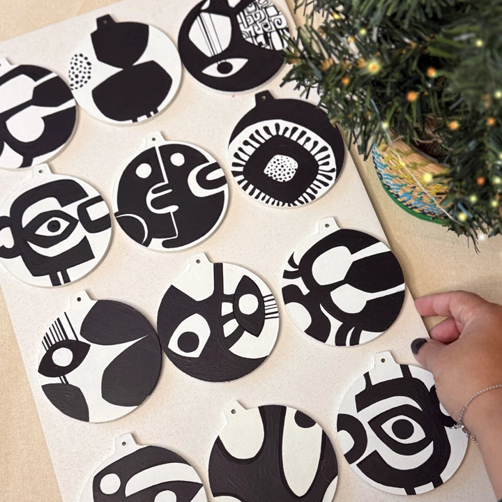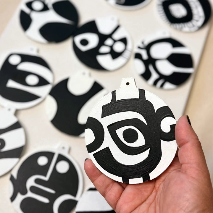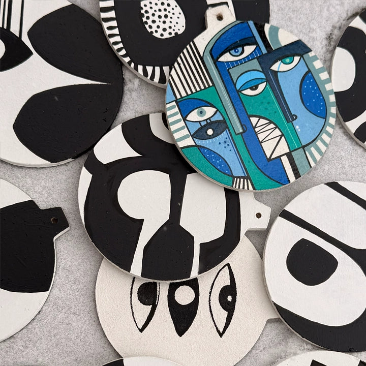 Handbemalte kubistische Ornamente auf runden, kompakten Holzscheiben, lackiert und fertig zum Aufhängen. Jedes dieser hängenden Ornamente ist ein kleines Originalkunstwerk, das nicht nur für die Weihnachtszeit gedacht ist, sondern auch an Fenster gehängt werden kann, um Büros zu dekorieren und ein einzigartiges Sammlerstück zu sein.