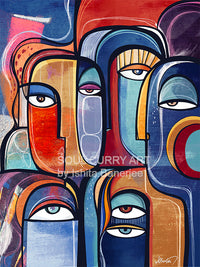 Moderne, abstrakte, vom Kubismus inspirierte Kunst der menschlichen Interaktionen, der Verbundenheit und der Wechselbeziehungen, die wir als Menscheit bewohnen.