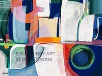 Terre is a mid-century style abstract artwork, blending soothing blues and greens with soft hints of warm colors, capturing the essence of the earth. The fluid, organic shapes evoke the natural rhythms of the land, with the cool tones symbolizing the oceans and lush landscapes, while the warm hues suggest the life and energy of the earth's core. Through minimalist forms and subtle contrasts, the piece creates a harmonious balance, inviting the viewer to connect with the grounded yet ever-changing nature of the planet.