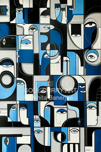 Die verwobenen Beziehungen komplexer menschlicher Emotionen. Die Schattierungen und Nuancen der Geschichten unserer gemeinsamen Menschlichkeit. Modernes, kubistisches Gemälde in verschiedenen Tönen von Ultramarinblau, Grau und Schwarz.